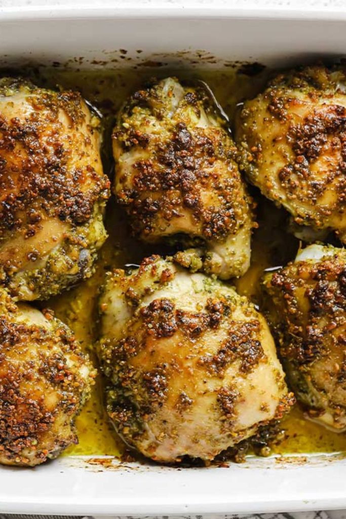 The idea of simply spreading fresh pesto over chicken thighs before baking sounds almost too easy but the result is anything but ordinary or simple. Laura Fuentes shows exactly how that fragrant, herby pesto forms a beautiful crust during baking that keeps the chicken incredibly moist and bursting with flavor.