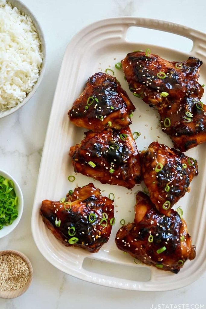 Homemade teriyaki sauce is one of those things that once you try it, you’ll never reach for the bottled version again it’s just so much fresher, more vibrant, and more flavorful in every way. Plays Well With Butter’s baked teriyaki chicken thighs are glazed generously in this gorgeous sauce that turns thick and beautifully glossy as it bakes.